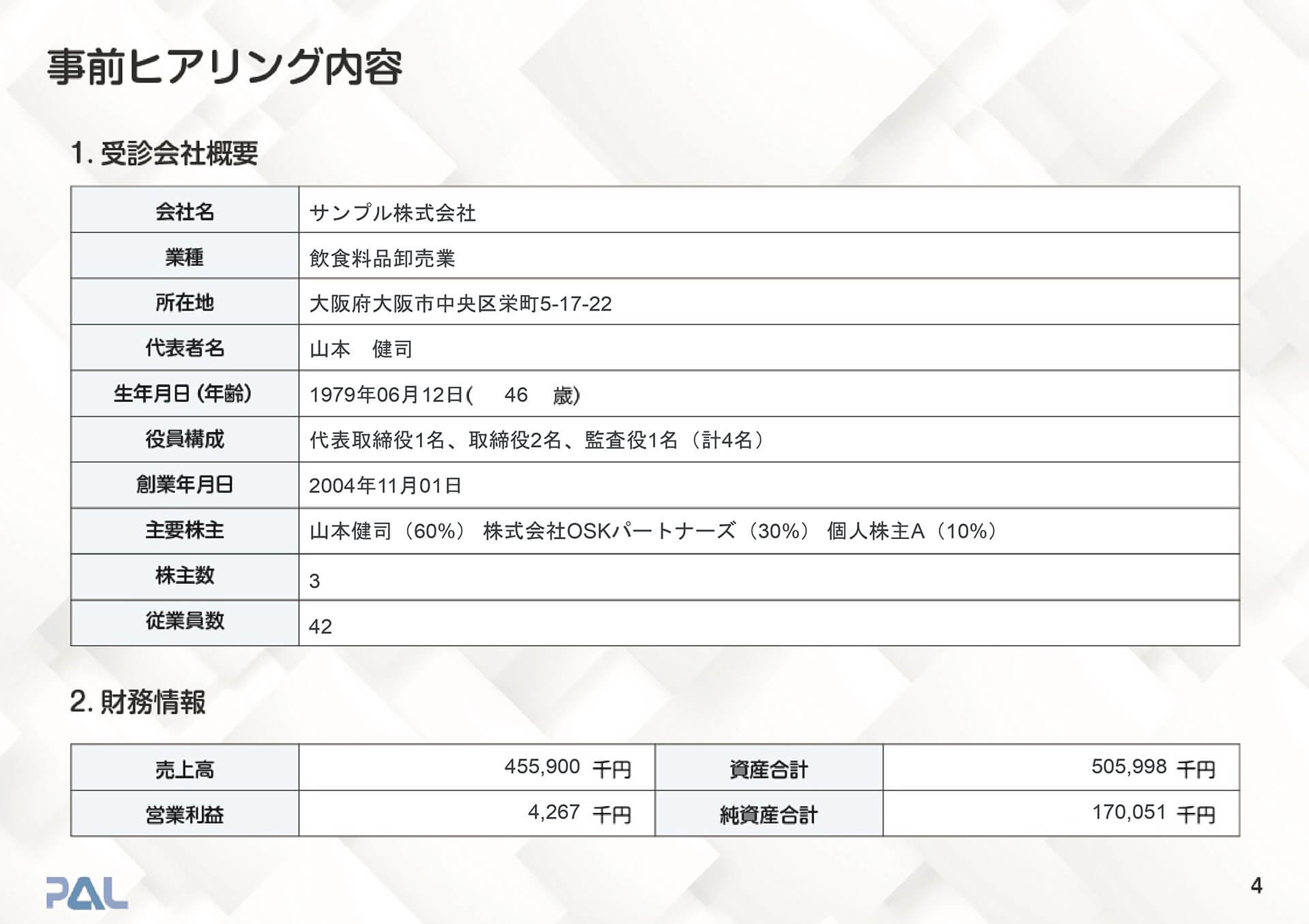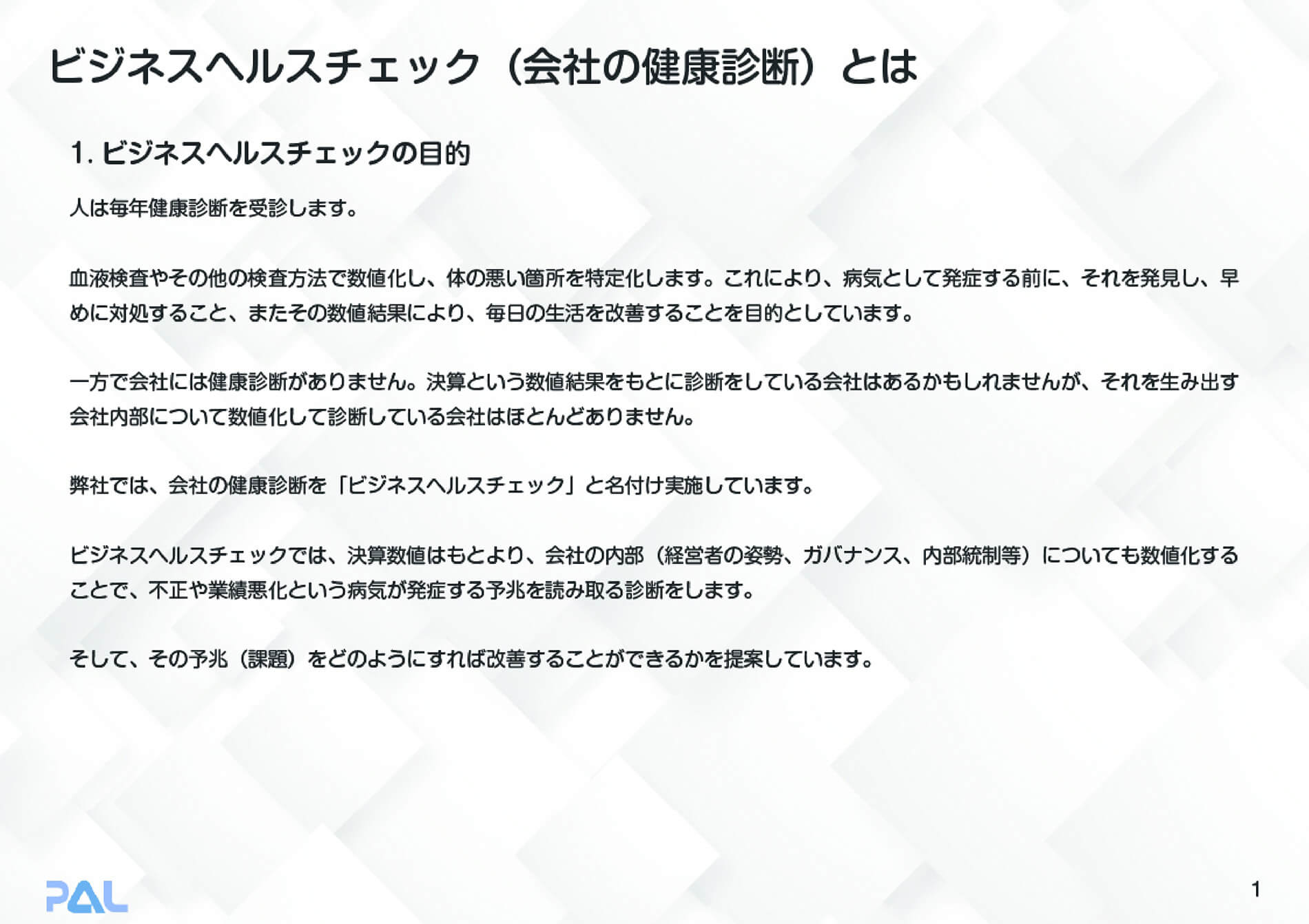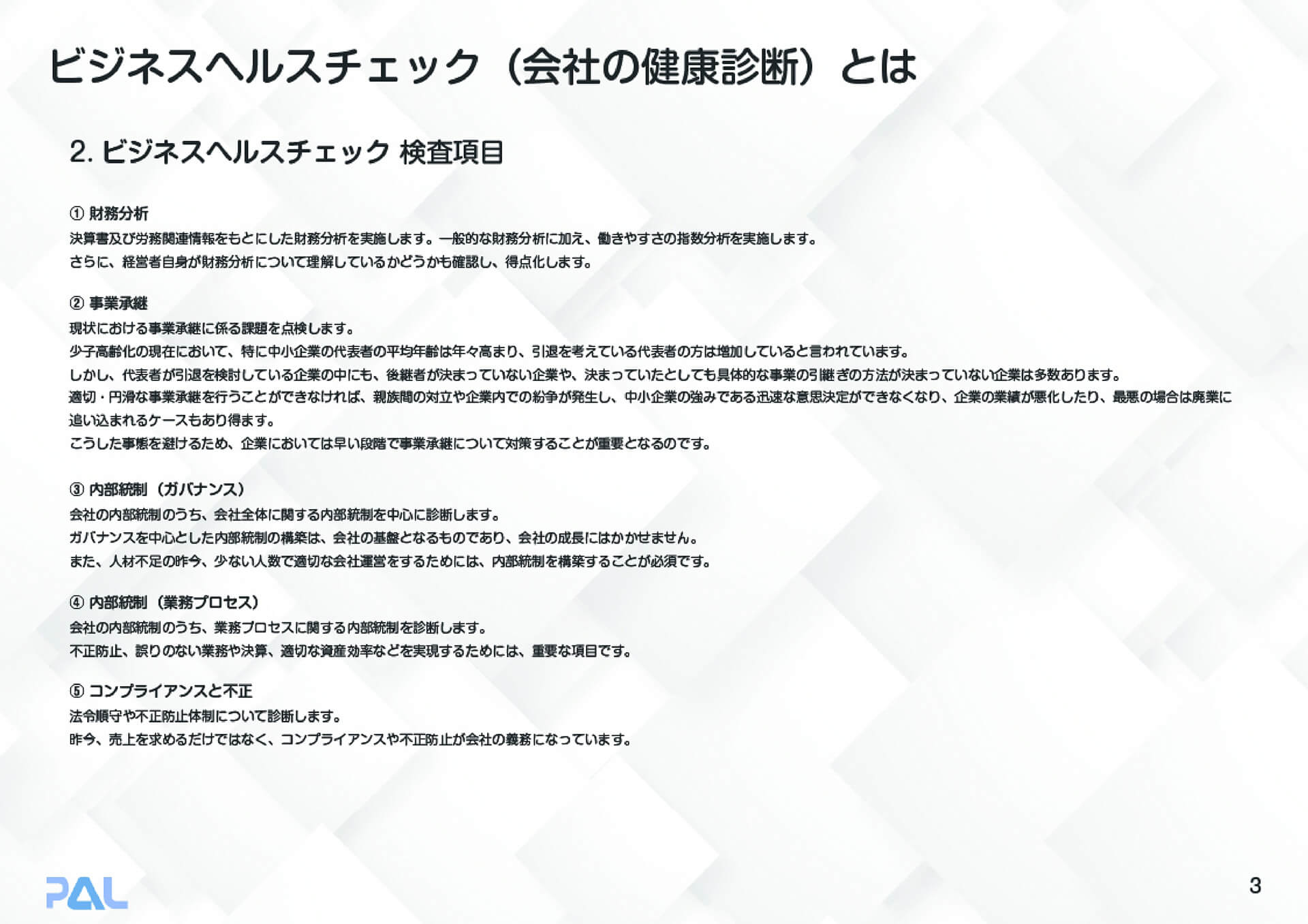 当社の「会社の健康診断」は、決算数値はもちろん、ガバナンス、内部統制、事業承継など、企業の内側を100項目にわたって徹底的に数値化。不正や業績悪化という「企業の病」が発症する前に、その予兆を見抜きます。健康な人間が長生きするように、健全な内部構造を持つ企業だけが永続します。